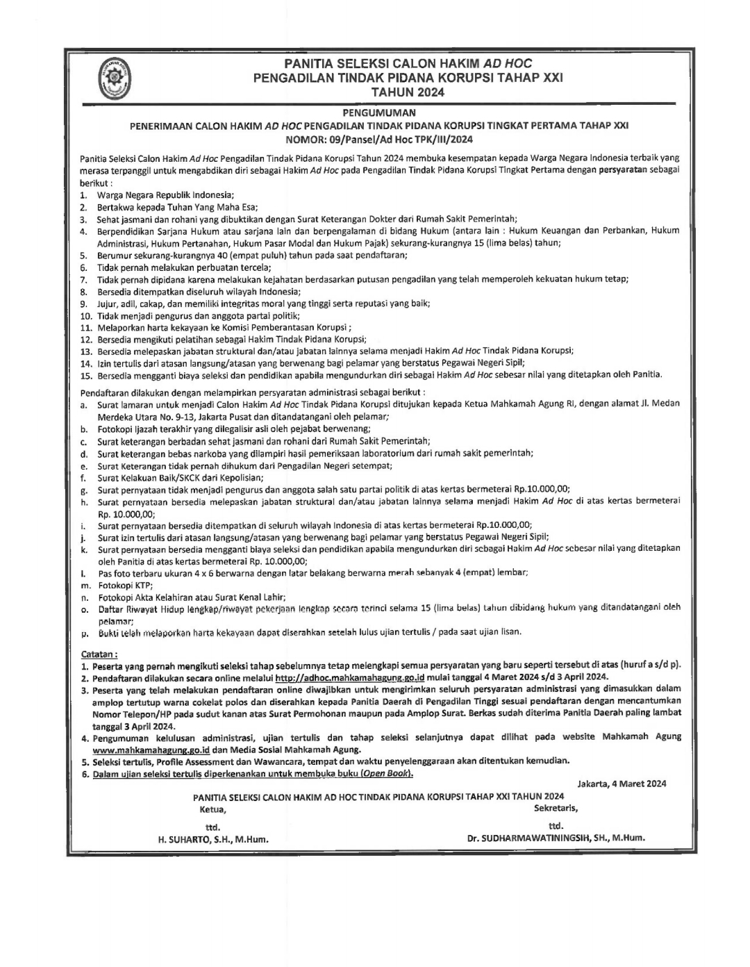 04 Maret 2024 Pengumuman Penerimaan Hakim Ad-Hoc Tindak Pidana Korupsi Tingkat Pertama Tahap XXI on Senin, 04 Maret 2024. Posted in Berita/Pengumuman Publik Continue Reading