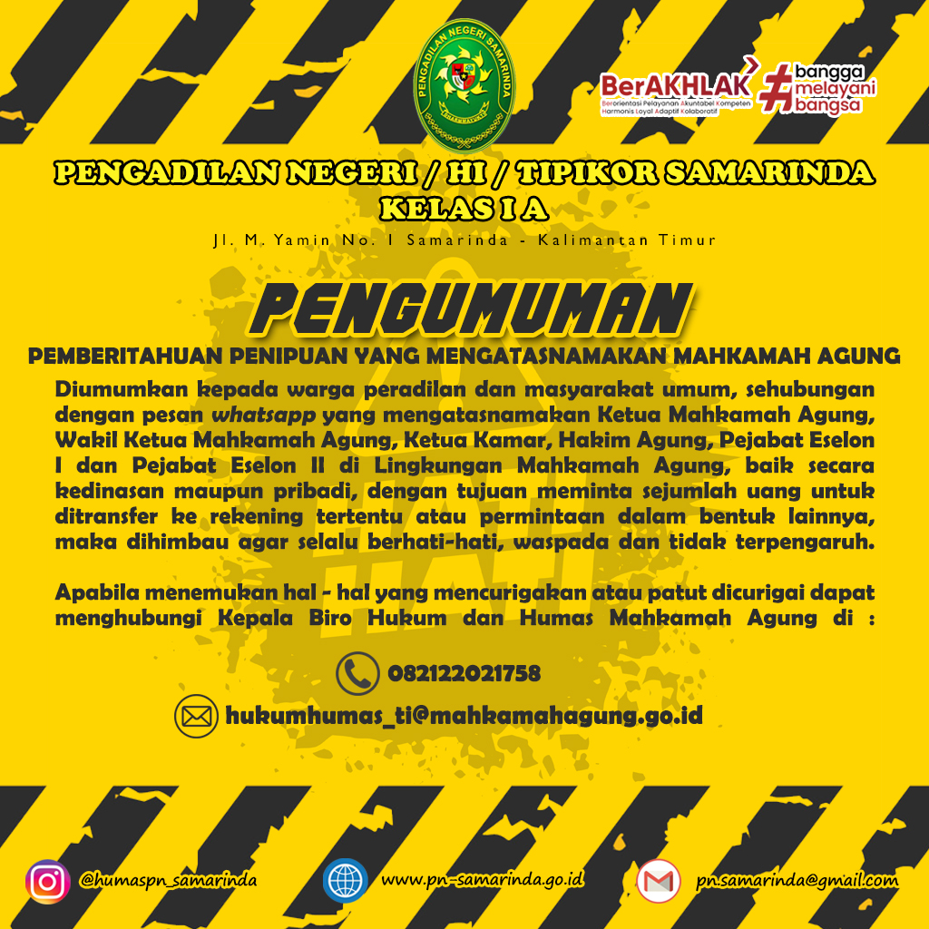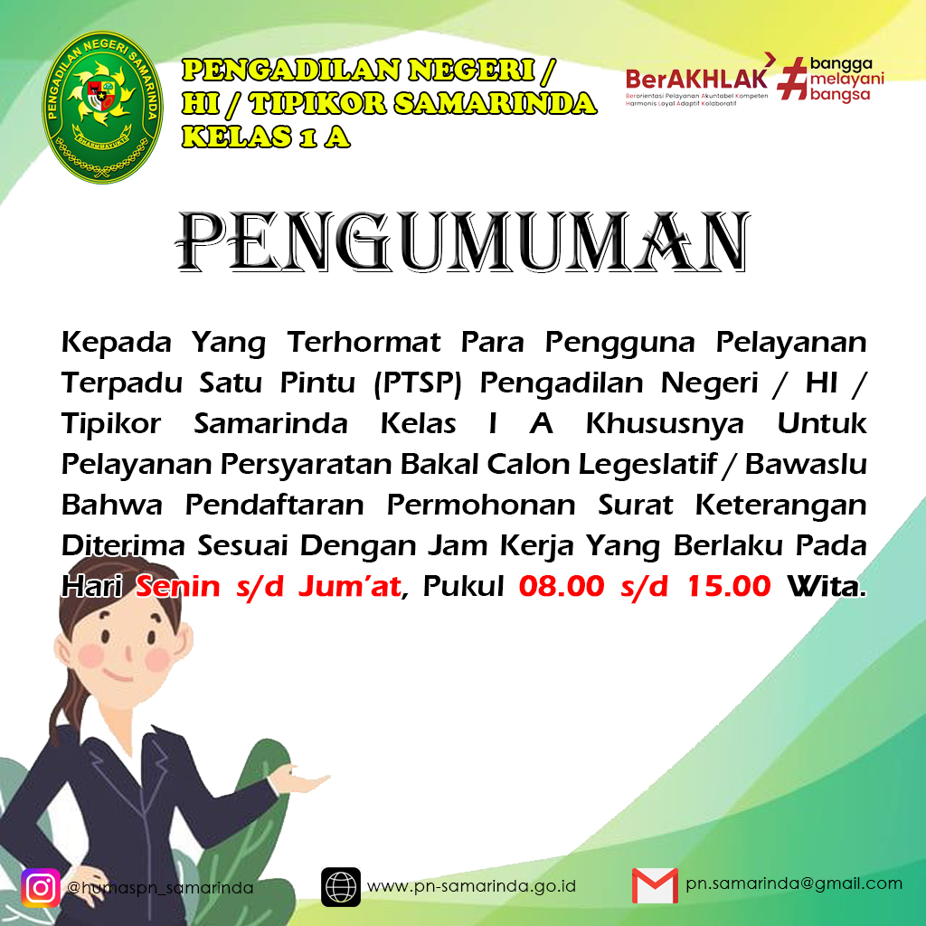 Kepada Yang Terhormat Para Pengguna Pelayanan Terpadu Satu Pintu (PTSP) Pengadilan Negeri / HI Tipikor Samarinda Kelas I A Khususnya Untuk Pelayanan Persyaratan Bakal Calon Legeslatif / Bawaslu Bahwa Pendaftaran Permohonan Surat Keterangan Diterima Sesuai Dengan Jam Kerja Yang Berlaku Pada Hari Senin s/d Jum'at, Pukul 08.00 s/d 15.00 Wita.